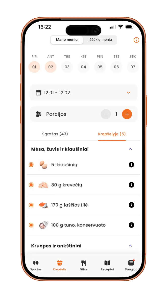 Jūs gausite jums skirtą asmeninį planą, kuris bus sudarytas pagal jūsų anketos atsakymus, išimant produktus, kurių nevalgote. Taip pat, galėsite naudotis patiekalų pakeitimo funkcija.